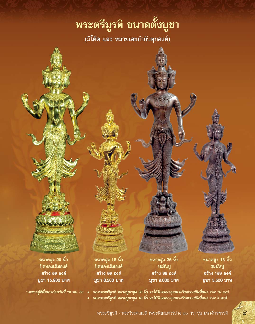 • จองพระตรีมูรติ ขนาดบูชาสูง 26 นิ้ว จะได้รับสมนาคุณพระวีระคณปติเนื้อผง รวม 10 องค์