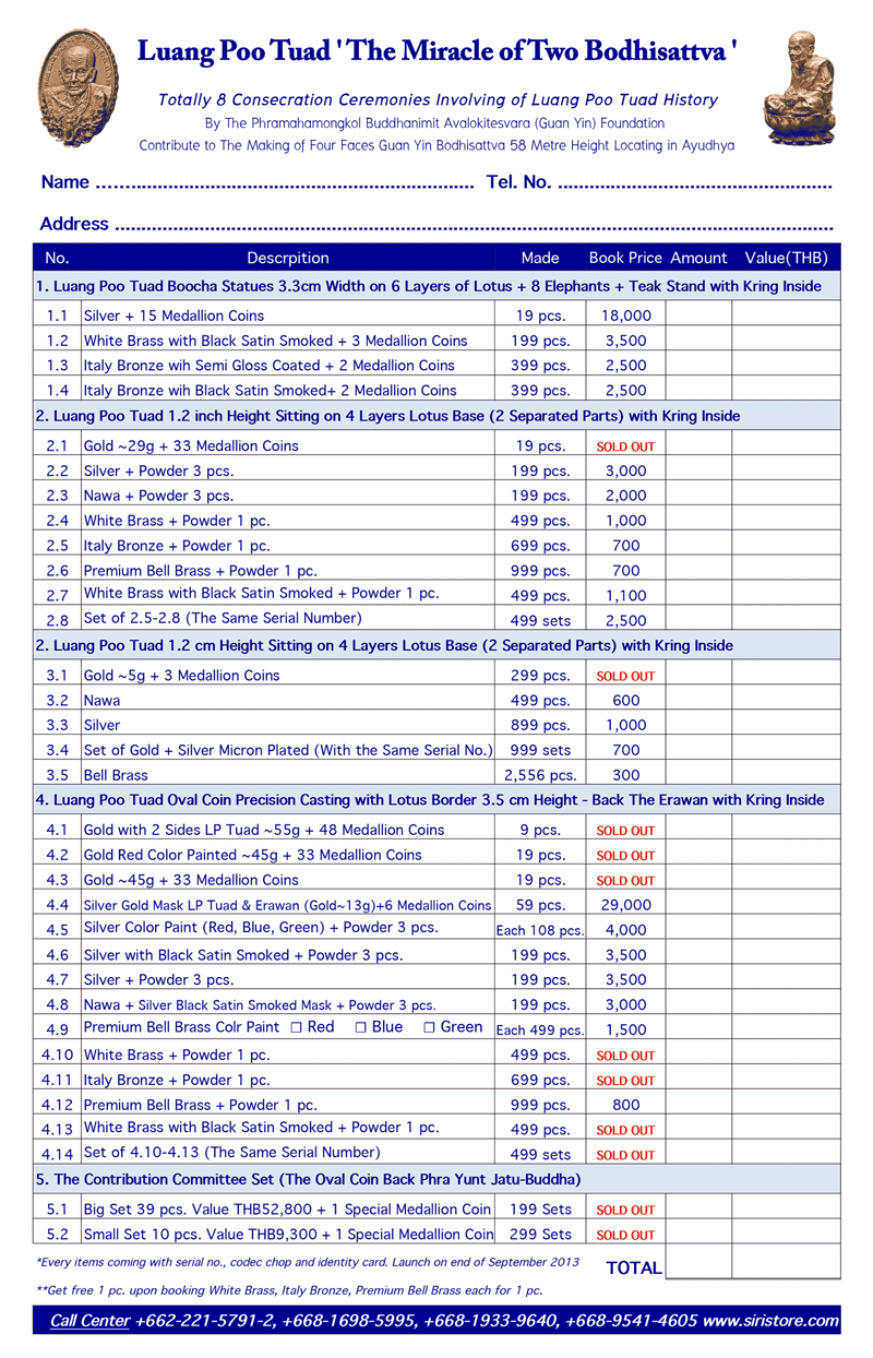 *** โปรดดูราคาบูชาและรายการที่ยังเหลือให้บูชาได้ตามใบสรุปรายการด้านล่าง ***