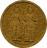 4) ดวงตราท้าวมหาพรหม-พระนารายณ์ (ขนาด 5 ซม.) จัดสร้างเป็นครั้งแรก (Pra Prom - Pra Narai circle 5 cm.) รูปแบบและความหมาย >> ด้านหน้า 1. องค์ท้าวมหาพรหม-องค์พระนารายณ์เป็นเทพเจ้าผู้สร้างโลกเทพเจ้าผู้รักษาคุ้มครองโลก ทั้ง 2 องค์ เป็นเทวะที่สูง สุด คอยเสริมสร้างความดี คอยปกป้องคุ้มครองภัยจากสิ่งไม่ดีรอบกาย จึงควรมีไว้สักการะบูชาห้อยคอติดตัวเพื่อเป็นสิริมงคล เสริมดวงชะตา 2. อักขระยันต์ ด้านบน หมายถึงเทพยดาทั้งปวง อักขระยันต์ ด้านซ้าย คือ บทพุทธคุณ นะ เมตตา ด้านขวา ยันต์เทวะ แคล้วคลาดและมหาอุตม์ ล่าง สุริยัน - จันทรา คือ การรวมพลังจักรวาลทั้งหลายทั้งมวล มาไว้ ณ ที่นี้ >> ด้านหลัง 1. องค์ท้าวจตุคาม-รามเทพ มือขวาถือจักรกับวชิระ มือซ้ายถือสังข์ ความหมายคือ ท่านทรงเป็นพระมหากษัตริย์ที่มี อำนาจทั้งการทหารและการปกครอง ที่คอยดูแลปกป้องภยันตรายและความเมตตาให้แก่ประชาชนอยู่เย็นเป็นสุข 2. ล้อมรอบด้วยวัฎจักร 12 นักษัตร เป็นสัญลักษณ์ตรงกับตราประจำเมืองนครศรีธรรมราช เพื่อความเป็นสิริมงคล 3. พญาราหู 8 ตน เป็นตัวแทนเทพผู้รักษาทิศทั้ง 8 มีอำนาจบารมี เป็นที่เกรงกลัวและช่วยขจัดให้สิ่งร้ายกลายเป็นดี สิ่งดีก็ดียิ่งขึ้น